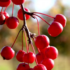 The ornamental varieties (as opposed to those grown for fruit) are adorned with yellow, orange or red fruit which starts showing color in late summer. Once the foliage drops, the low autumn sunlight highlights the glossy fruit beautifully. This show lasts from late summer through midwinter, depending on how many hungry birds or squirrels are nearby!
